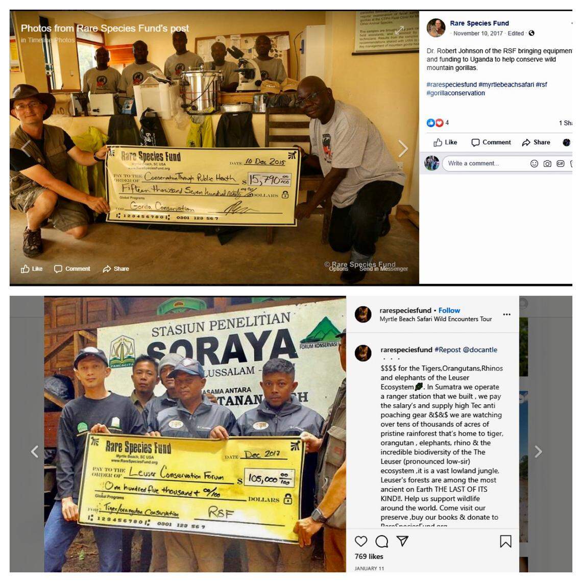 The check for the Uganda organization shows $15,790, while the Rare Species Fund’s report shows no money granted to foreign organizations in 2015, and the check for the Sumatra organization shows $105,000, while less than $35,000 was reported as given to foreign organizations in 2017.