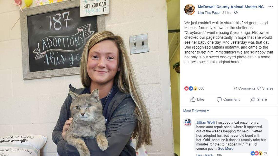 This story was originally published March 29, 2019 at 3:18 PM with the headline "Mittens the ‘one-eyed pirate cat’ reunites with owner after 5 years, NC shelter says."