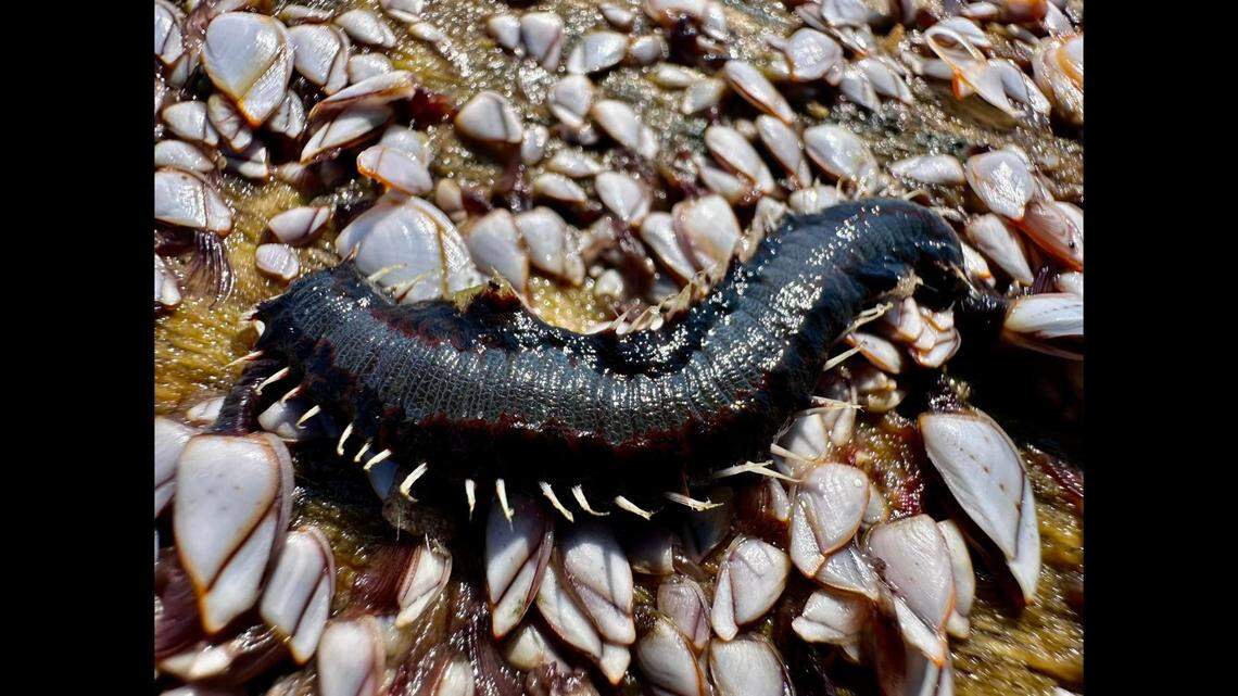 “We’ve found a few of these marine polychaetes, sometimes called bristle worms, washing up over the past couple of days on large logs,” researchers said. “The logs these were found on had gooseneck barnacles all over them, which might have been what the worms were feeding on.”