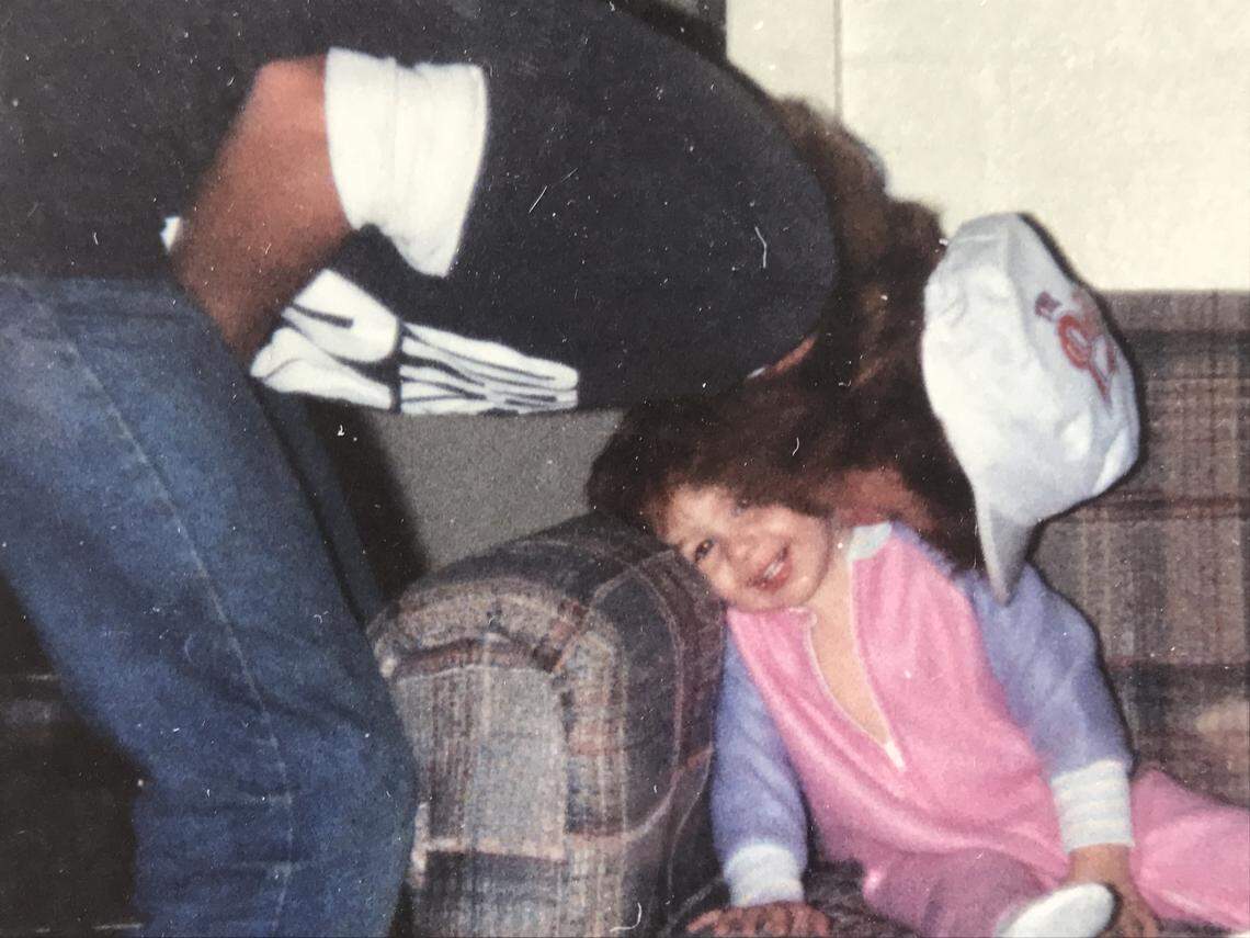 The pages turn to Kimi as a toddler, sitting on the family couch as Dann leans in to give her a kiss on the cheek.