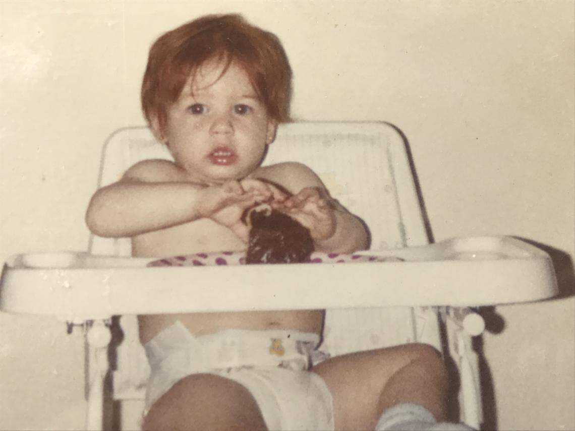 As a baby, Kimberly sits in a white high chair — her red hair the only color in the photo. Wearing a diaper and socks, she looks back at the camera with what seems an inquisitive stare.