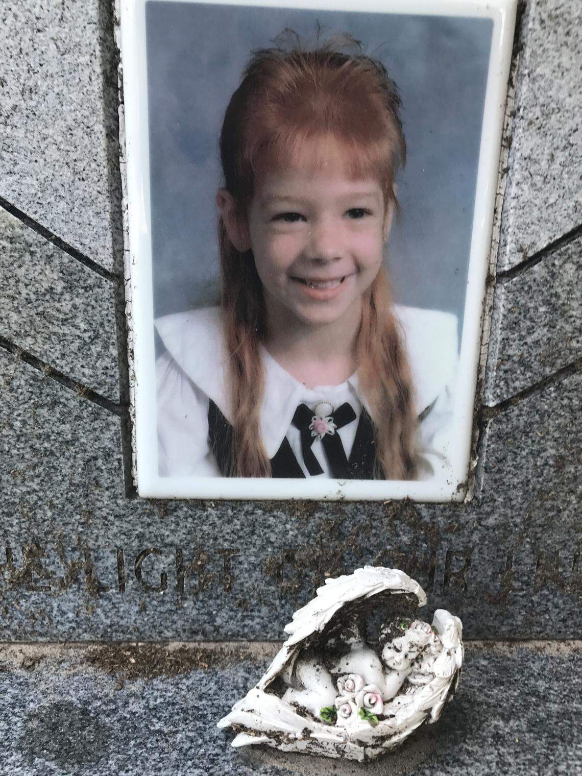 Her eyes closed, face swollen. She wears a Girl Scout’s uniform. A stuffed animal, glass angel and a picture of her family have been carefully placed inside the coffin next to her body.