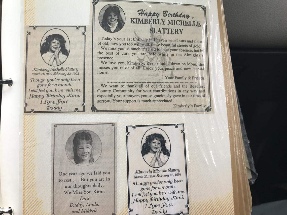 For Kimi — it is clips of memorials Barb and Dann placed in the newspaper remembering her birth and her death day each year.