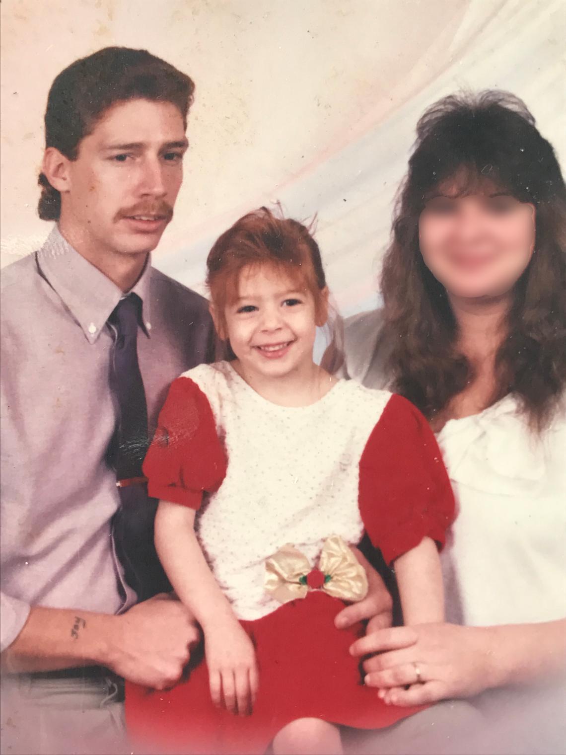 A formal photo of Dann, Jennifer and Kimberly looks similar to the ones many families had taken at department stores during the era. Jennifer and Kimberly wear their best dresses and Dann has on a tie. Kimi sits between them in front of a draped fabric background.
